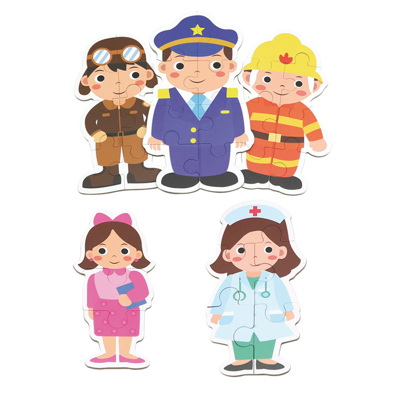 6 Puzzles progresivos de cartón con personajes de profesiones. 3, 4, 5, 6, 7 y 8 piezas respectivamente. Medidas de los puzzles de 15 a 23 cm.