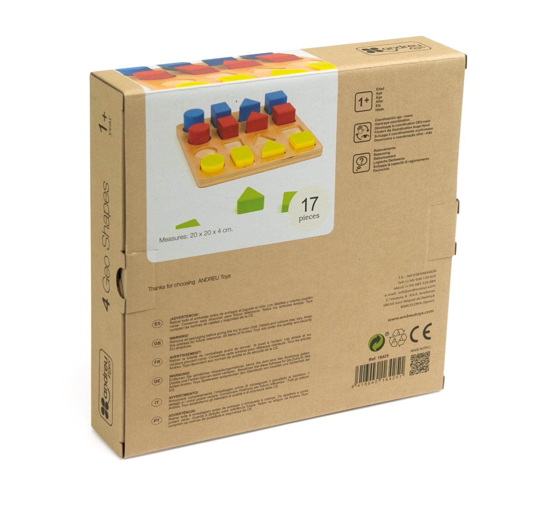 Educational toy to introduce and teach multiple concepts such as geometric shapes, height and color, through fun activities such as stacking, sorting and counting. Children will have fun placing the pieces in the appropriate place of the sturdy wooden base. Wood shapes can also be used as building blocks and stacking. Apart from teaching geometric shapes, colors, height and learning to count, this toy also develops hand-eye coordination and motor skills. Board thickness: 1.3 cm. Product dimensions: 20 x 20 x 4 cm