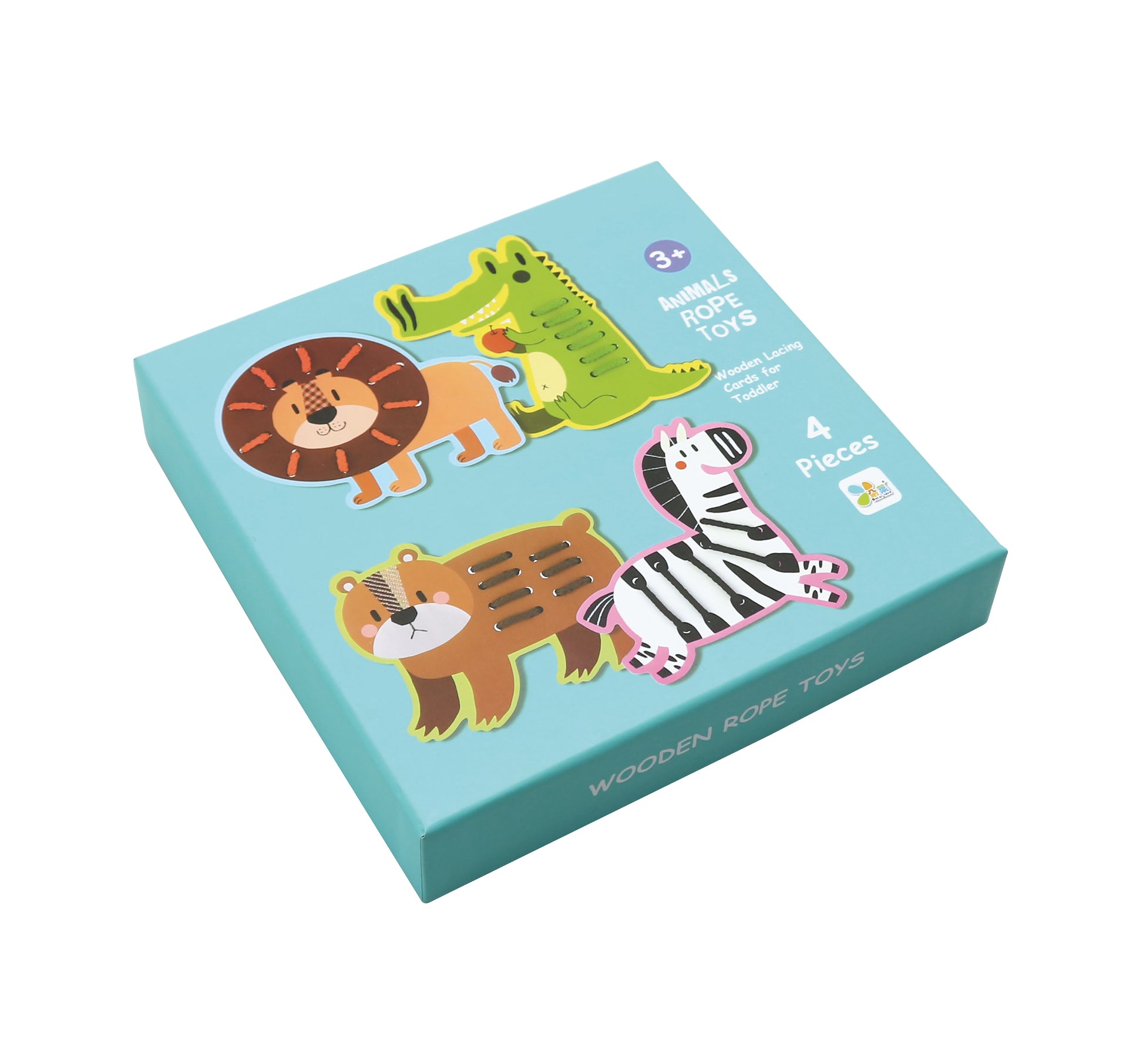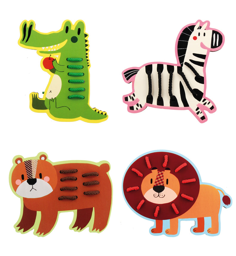 4 animales gigantes de madera para enhebrar, con cordones de colores.