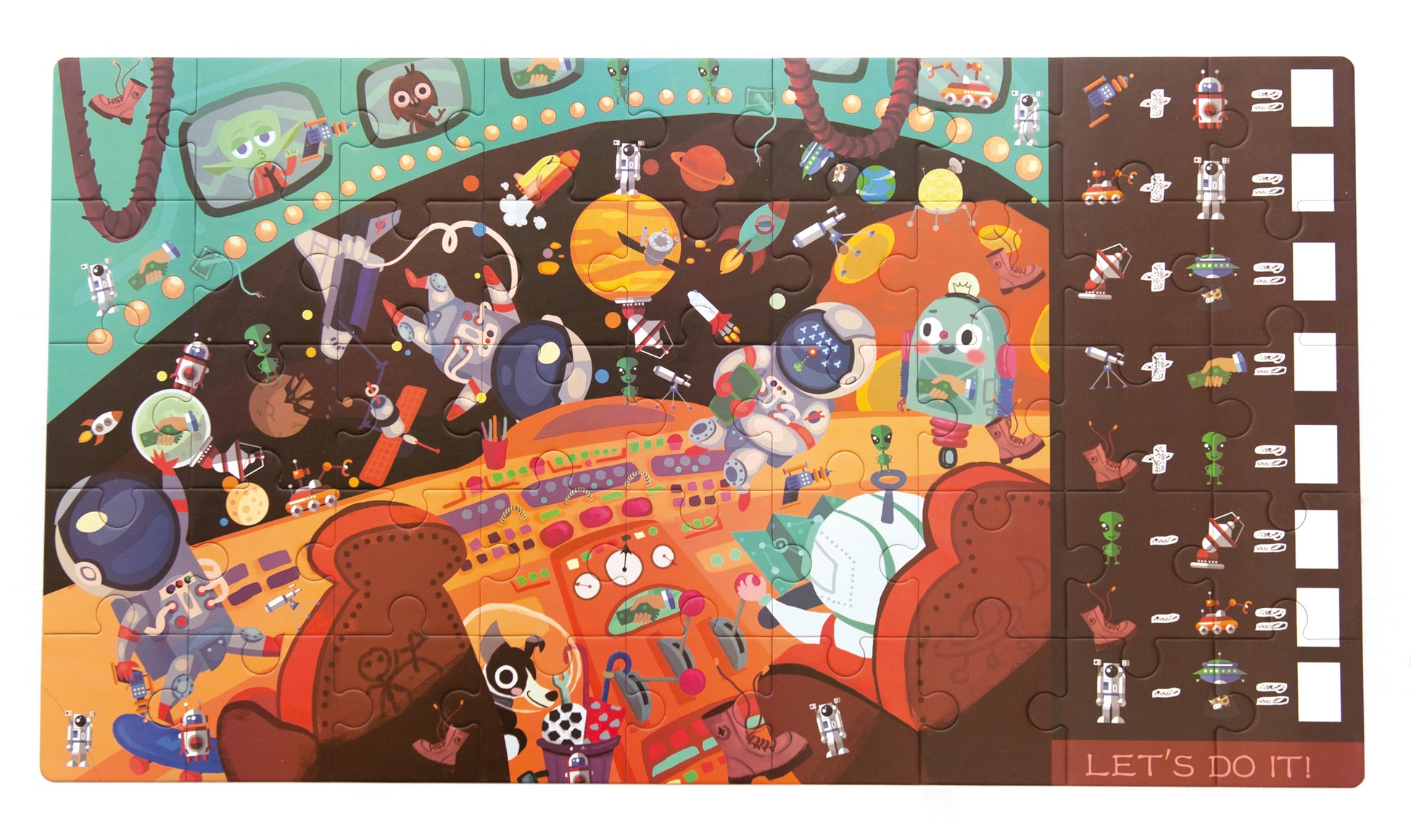 Puzzle con 45 piezas gigantes que representan una escena del espacio sideral..! Incluye un juego para hacer algunas operaciones básicas de suma y resta. De la operación matemática que vayas a realizar, primero localiza y cuenta las unidades que hay de esos objetos en todo el puzzle y posteriormente, suma o resta para obtener el resultado final. Ideal para el desarrollo de las primeras operaciones matemáticas. 90X50cm.