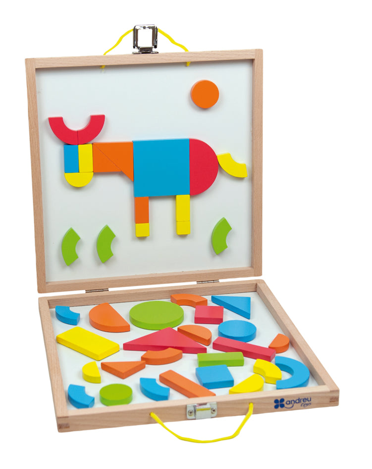 Box of magnetic shapes of colors to create figures, objects, etc. 24 templates + 42 pieces.