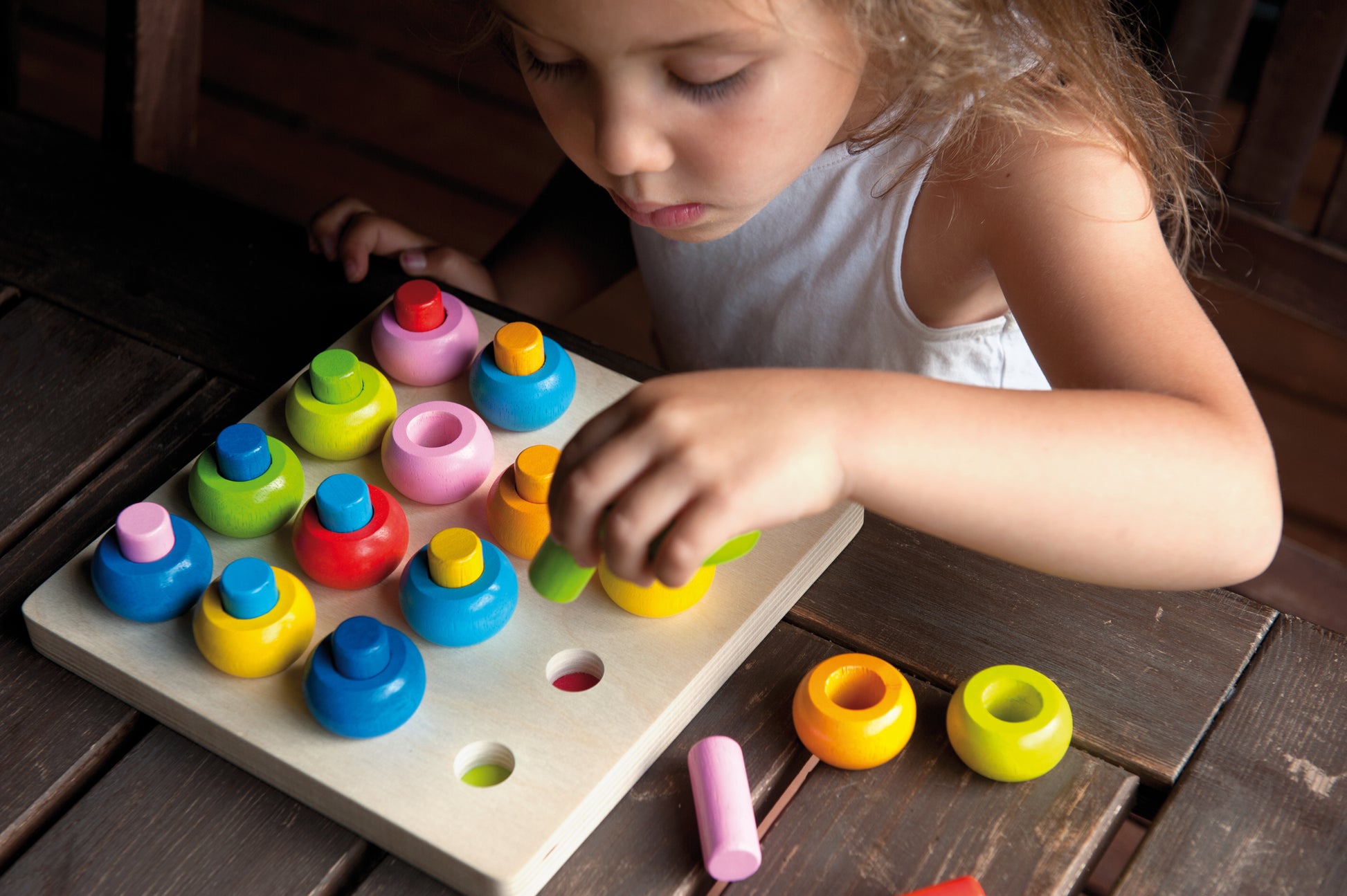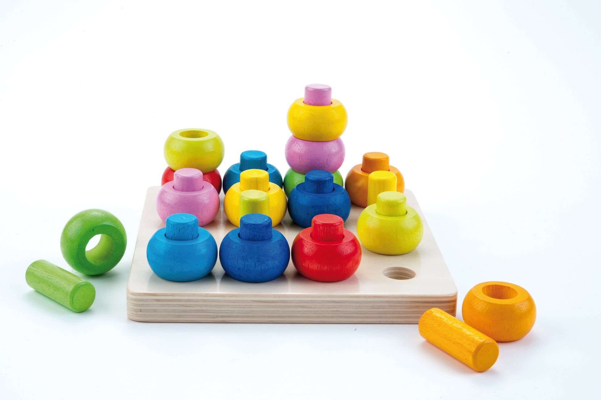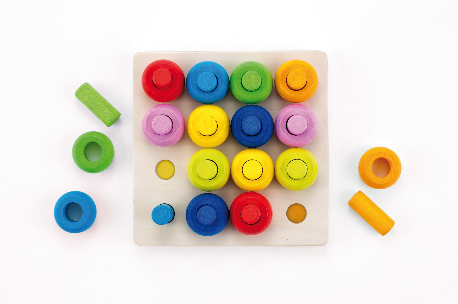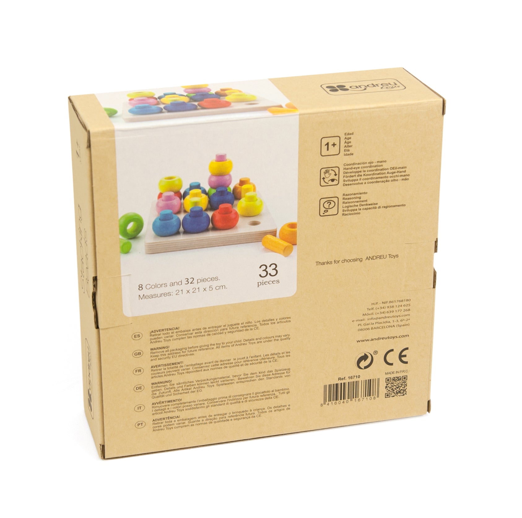 8 colores y 32 piezas para encajar y emparejar en el tablero según el color. Piezas diseñadas para un mejor agarre.