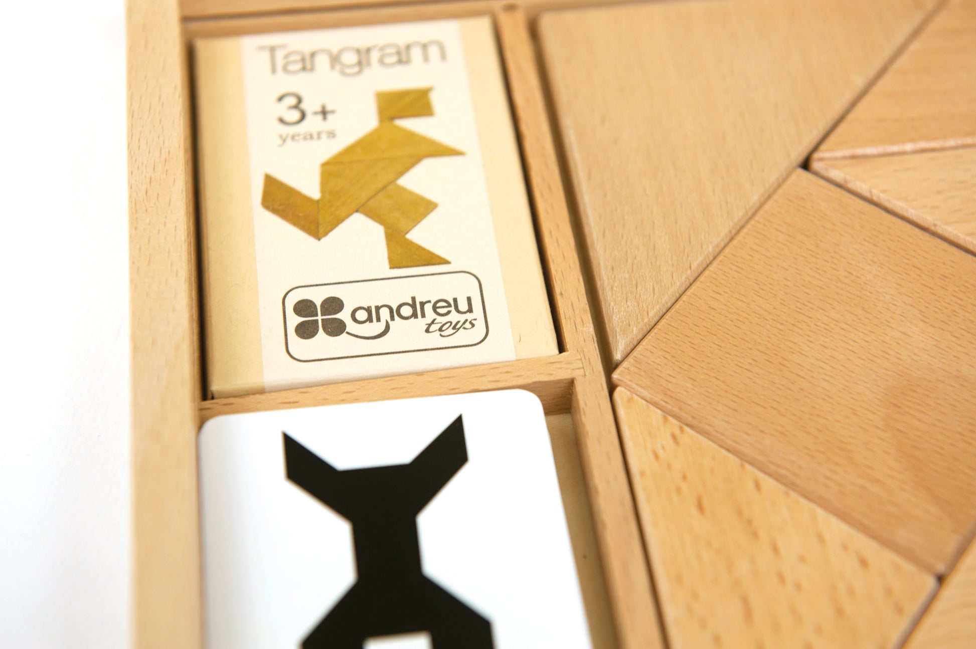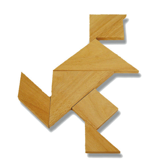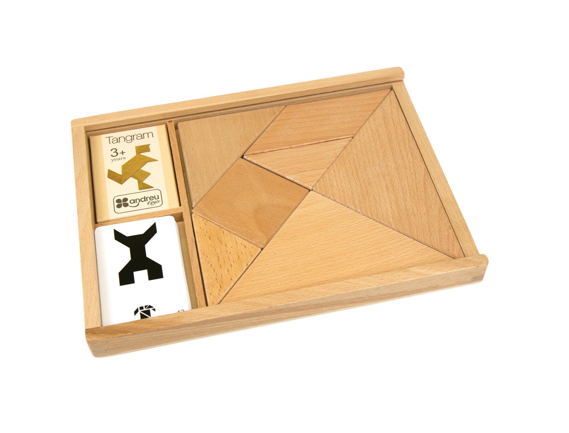 7 piezas tangram de madera. Se incluyen 27 tarjetas de doble cara con la solución en el reverso. Se pueden crear 54 figuras con este popular juego.